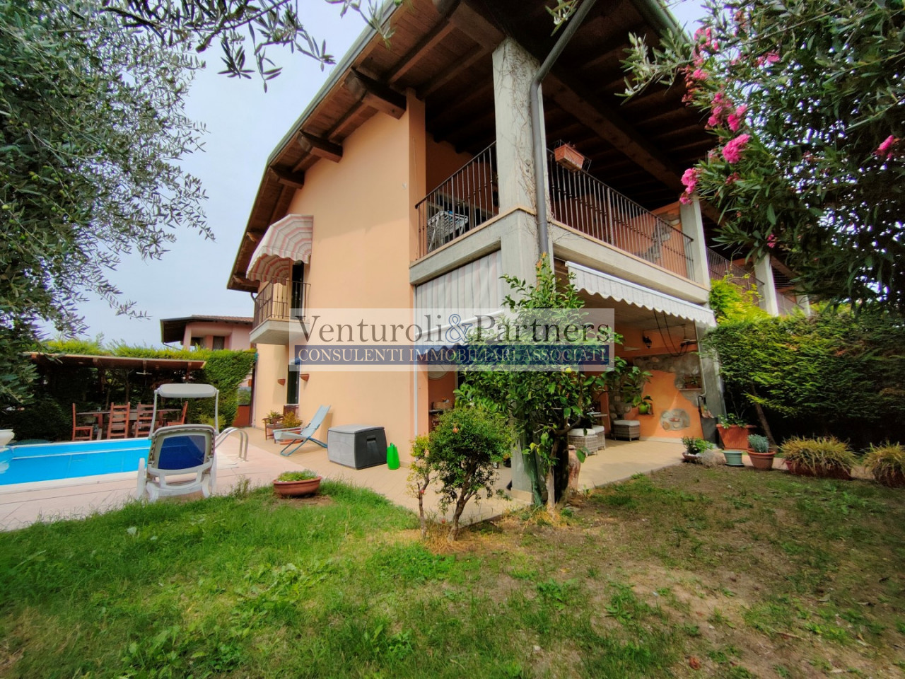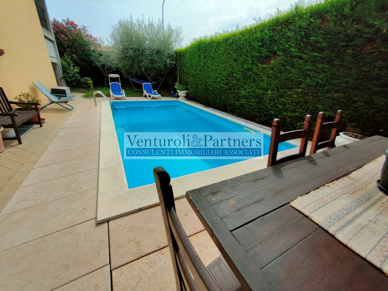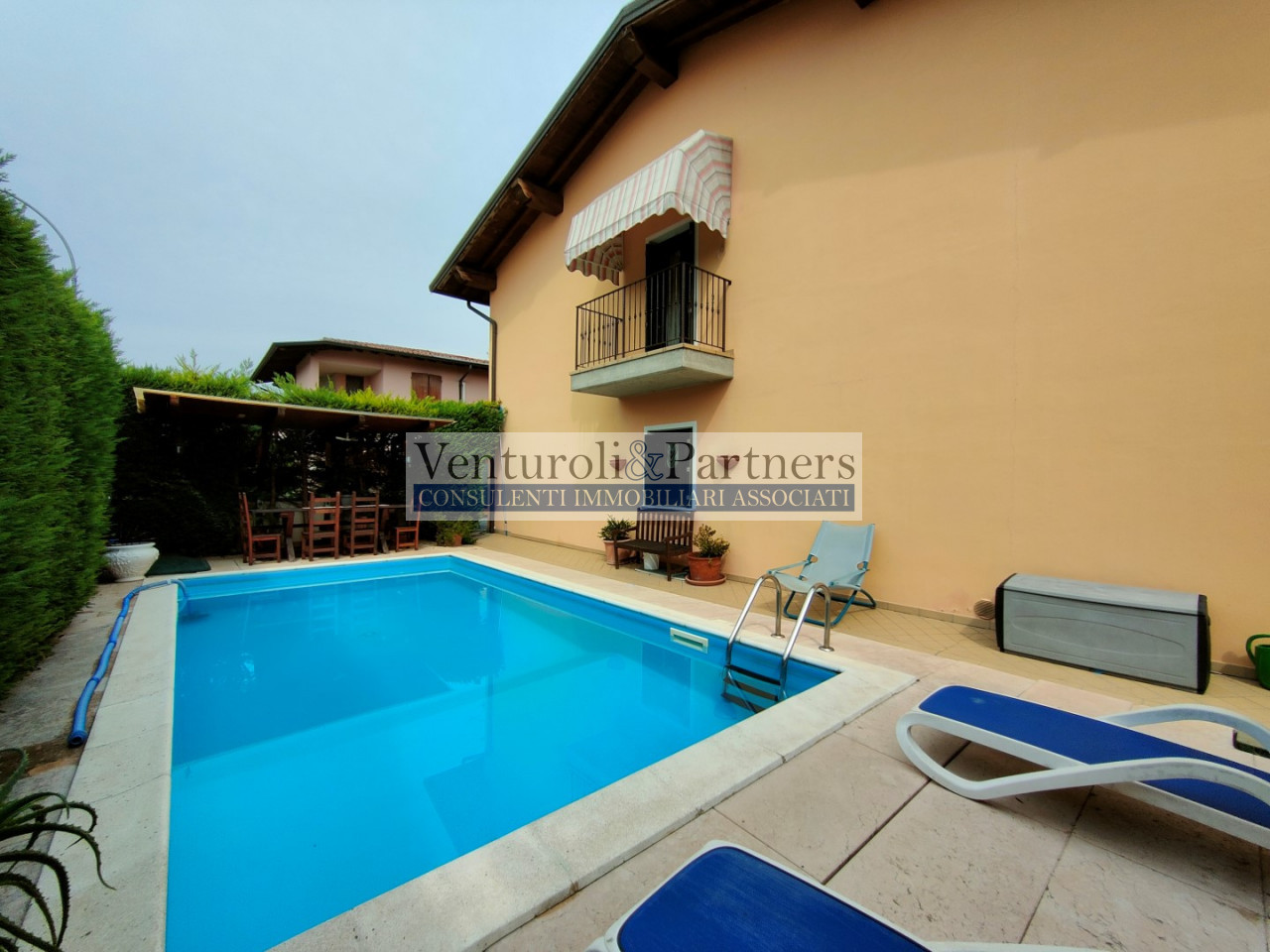 villadi notevoli metrature con giardino sui tre lati e piscina privata, portico e zona relax, comodissima a tutti i servizi e all' autostrada. A piano terra soggiorno importante e cucina separata, bagno. A piano primo tre camere, bagno padronale, loggia. Al piano interratto tavernetta, lavanderia e doppio garage. La casa è ben tenuta. Prezzo leggermente trattabile.